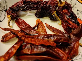 - Half cup each two kinds of dried red chillies, Kashmiri and the regularly available one. Kashmiri adds color, regular adds heat and you can adjust the proportions according to taste.