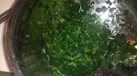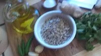 Throw in the ginger/garlic. Salt to taste. Powder the sunflower seeds and add cilantro, fenugreek, leaves (optional), line juice and about half cup of olive oil. It forms into a pesto. Taste to see if the salt is OK. Keep aside.