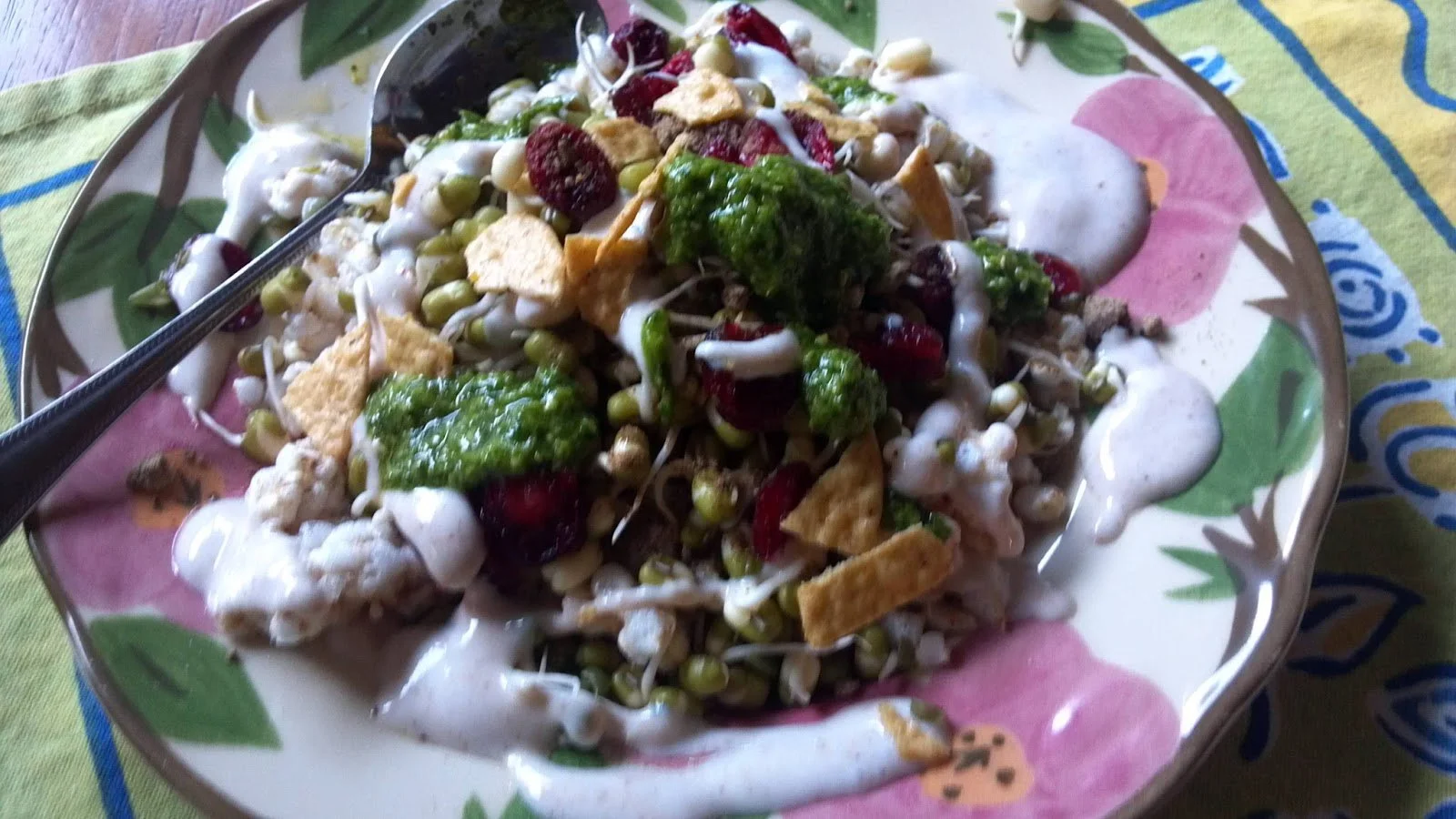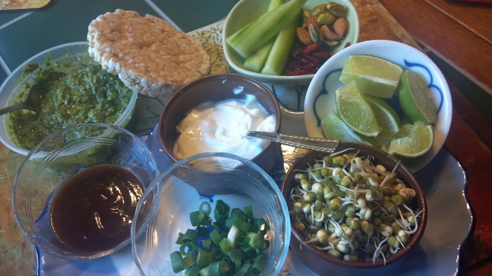 Arrange the rice cake (or rice crispies)on a plate. Smear it with the pesto. Pour the mung sprouts over the pesto. Squeeze the lime and a pinch of salt over the sprouts. Sprinkle the green onions, cucumbers, nuts over that and then drizzle the yogurt over the nuts and dot it with tamarind sauce.