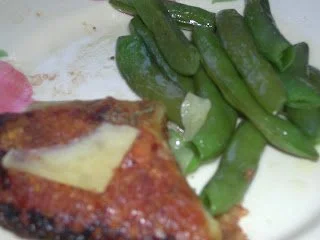 Shock the snap peas with very cold water. Heat butter in a pan, throw in the peas, salt and sugar. Saute it until the snap peas look shiny and buttery. Sprinkle it with the garlic powder and serve it with grilled fish. (Or, as in the picture, I had served it with potato and fontina cheese bake).